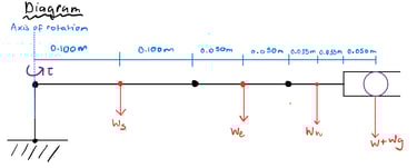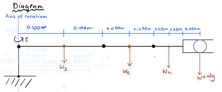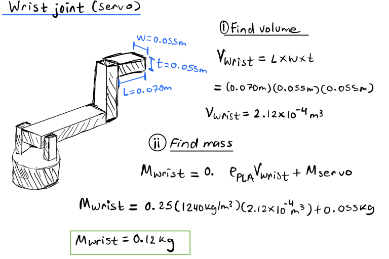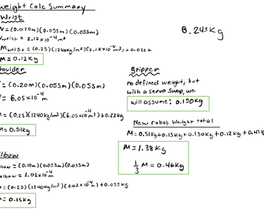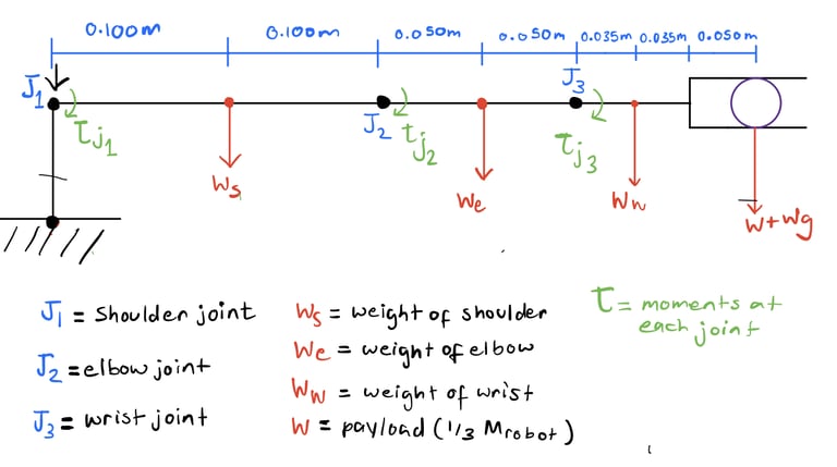 After estimating the total mass of the links, I calculated the worst-case scenario torque required to lift 1/3 of the robot’s weight (0.46kg). I used a simplified diagram of the arm in its least advantageous position to find the moment created at each joint by the weight of each link and the weight of the 0.46kg payload: