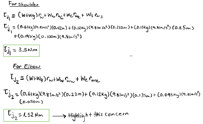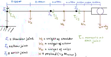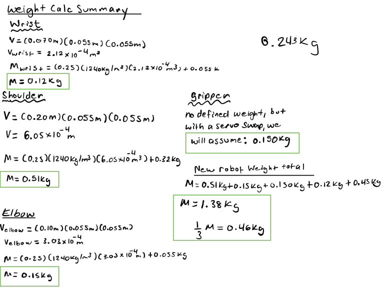 The goal behind my calculations was to determine the torque required for each joint, with the goal of ensuring that the design specification of a 1:3 strength - to - weight ratio was met. We used these calculations to spec our motors and gear trains. These calculations relied on simplified but conservative models: