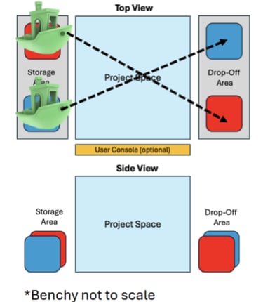 As part of our ME380 course, we had to work in groups of 5 to design a device capable of moving objects from a defined storage area to a defined drop-off area. Ontop top of this, we had to pick two additional criteria to hit with our design. The criteria we set were as follows: