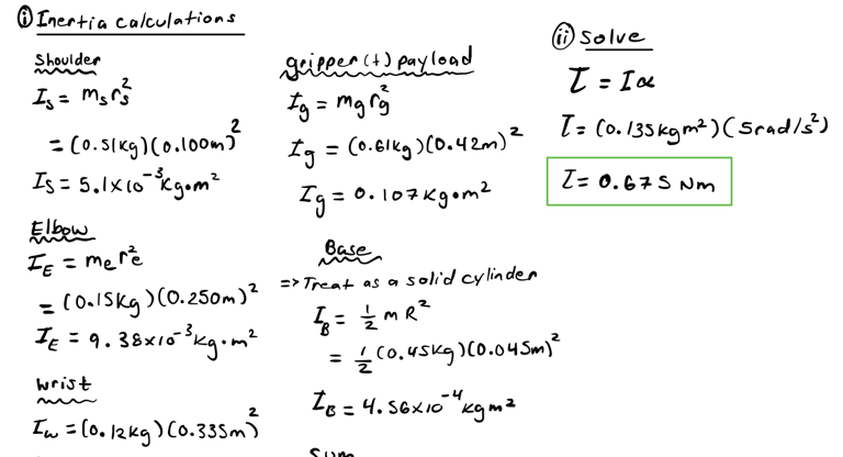 I used a slightly different approach for the rotational base joint. The main concern with this joint came from the inertia it would have to overcome to rotate the weight of the entire arm. To calculate the torque required to do this: